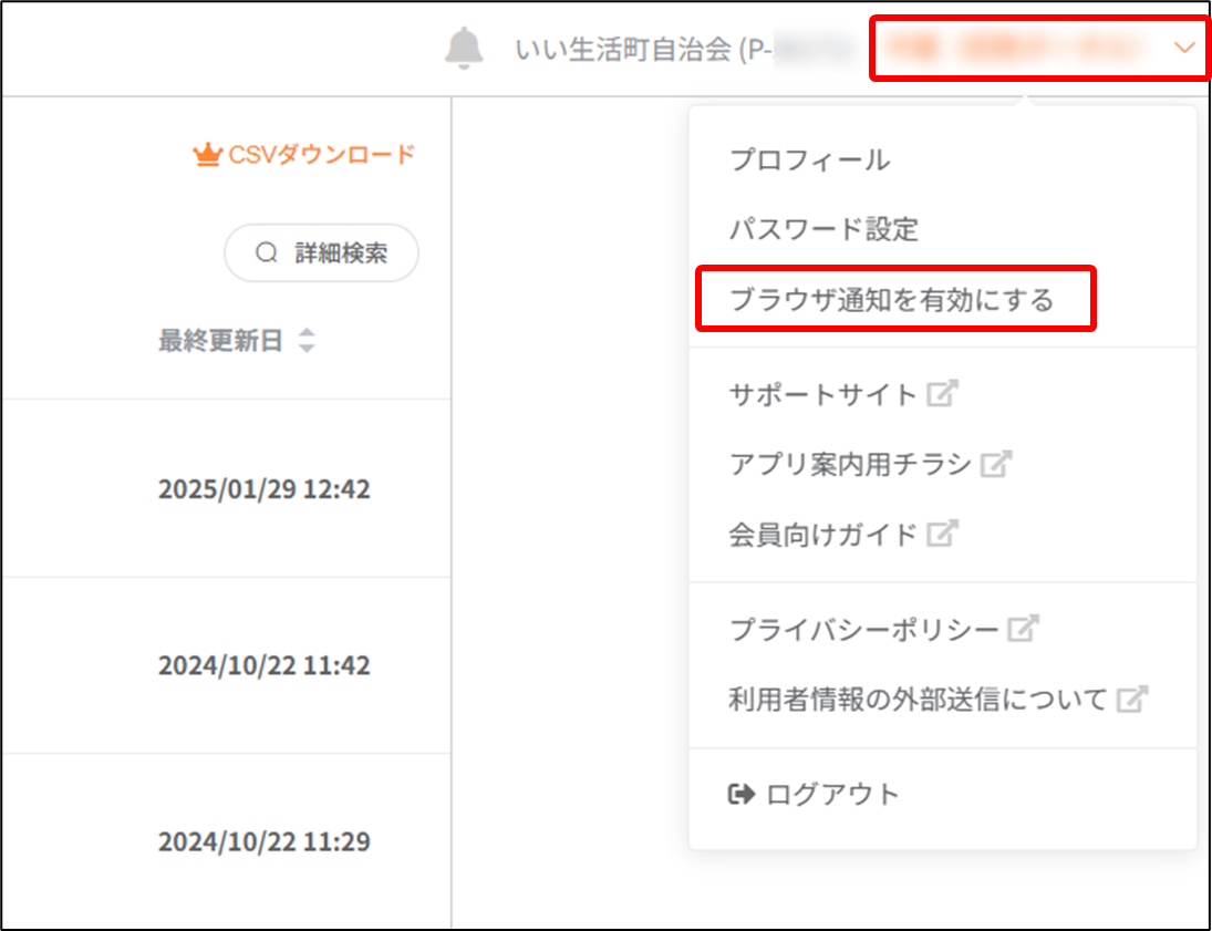 画面右上のアカウント名をクリックし、「ブラウザ通知を有効にする」を選択してください。