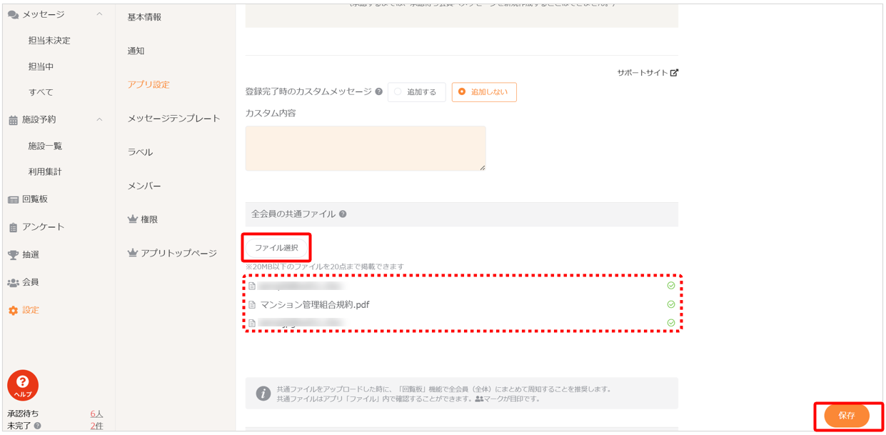 「入居のしおり」など全会員に対して必要なファイルをアップロードすることができます。