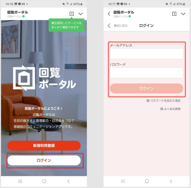 ⑤回覧ポータルのログイン画面に切り替わりましたら、「ログイン」へ進み、