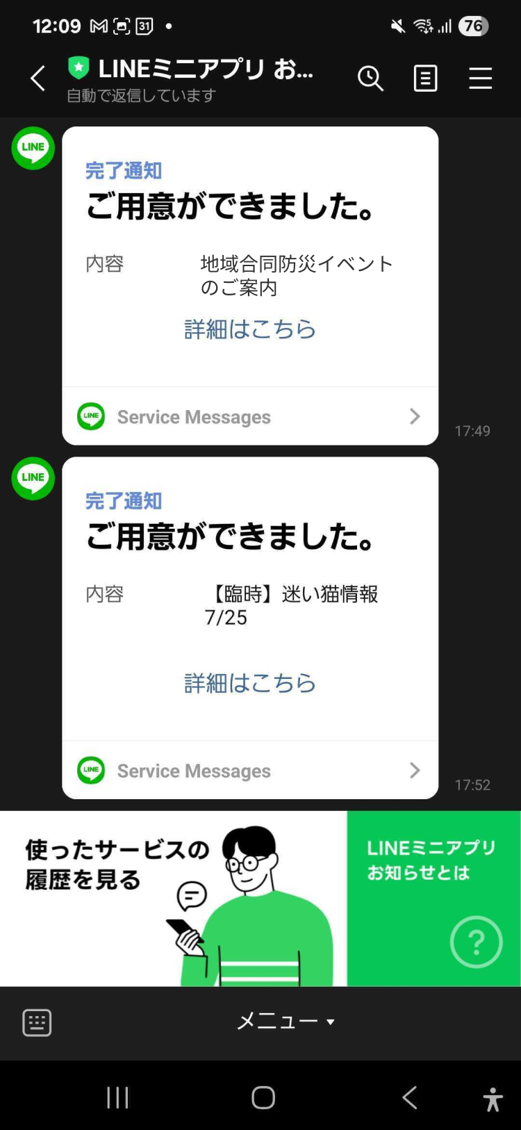 回覧ポータルアプリへ新着の回覧版、メッセージが届くとLINEミニアプリにて「完了通知」が届きます。