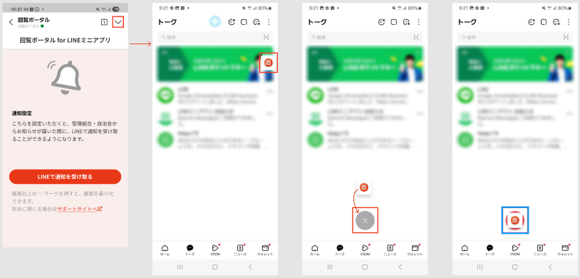 通知設定を行った後、右上の∨ボタンでLINEミニアプリを最小化することができます。
