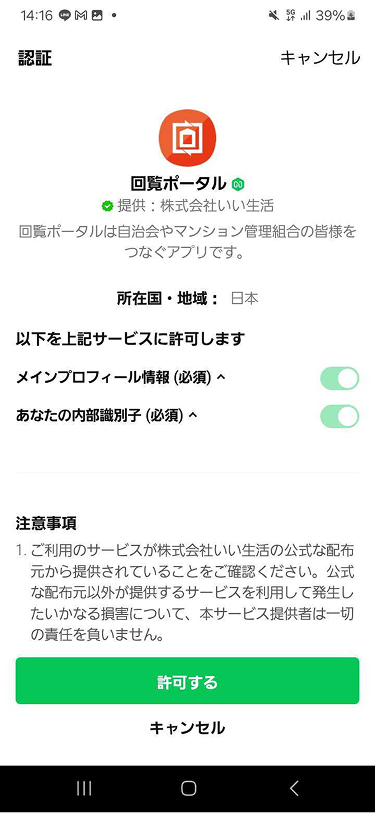 ②LINEミニアプリ画面が起動し、確認事項に同意し「許可する」を押します