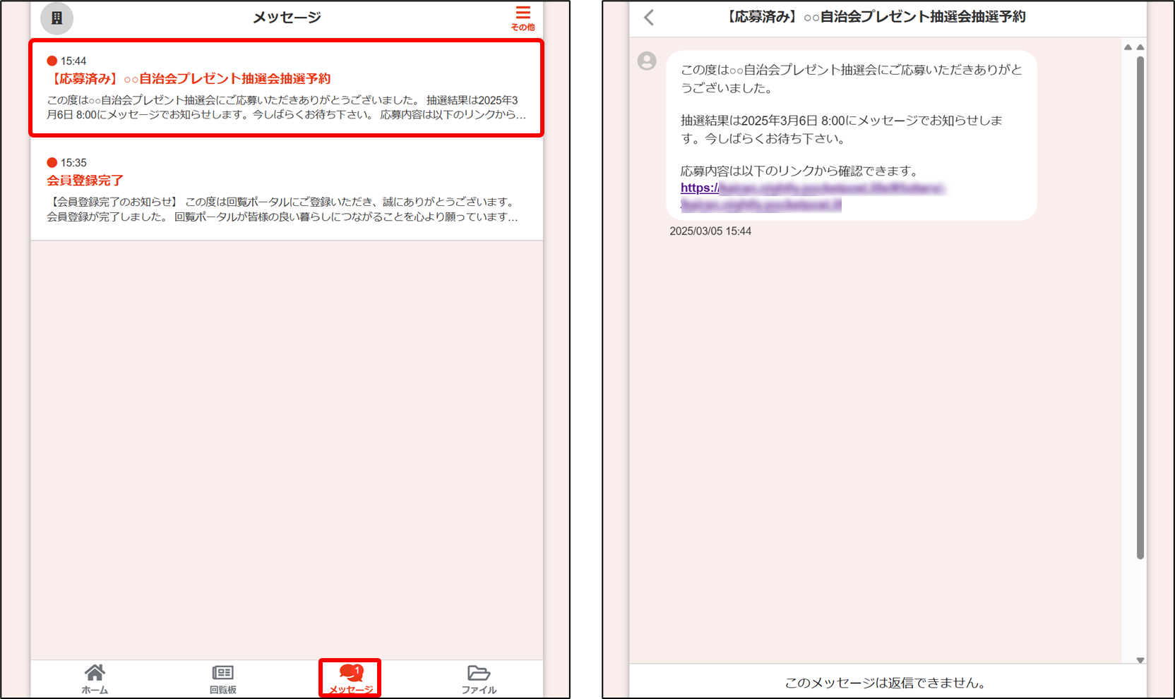 ②「応募する」ボタンより応募が完了すると、メッセージタブに抽選応募通知の