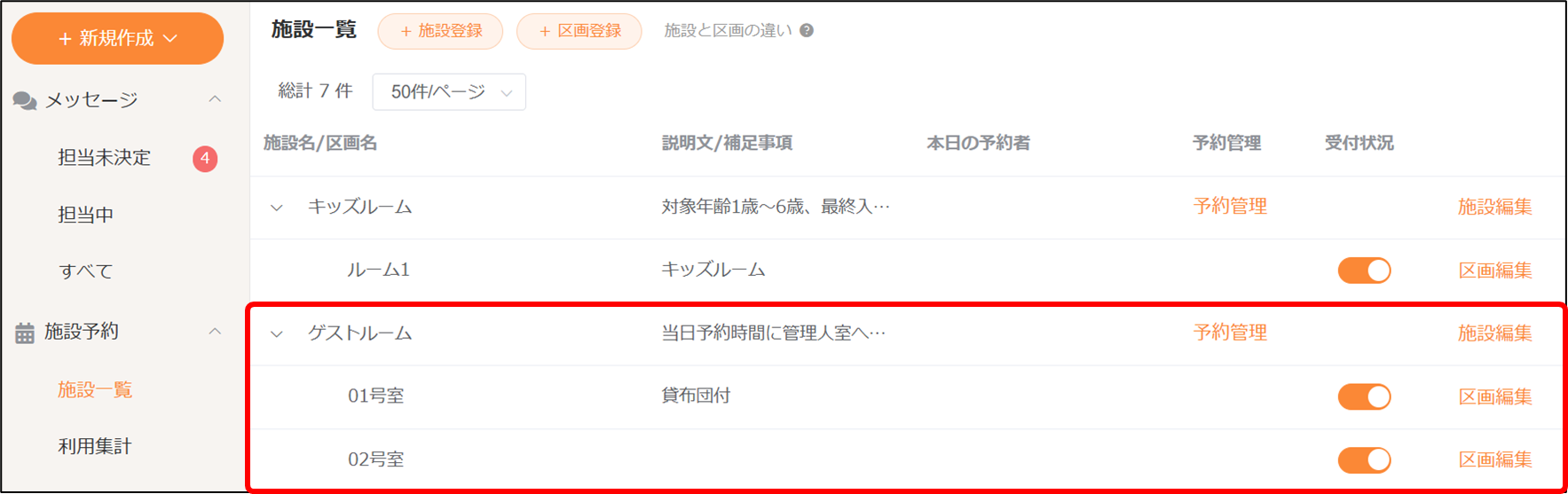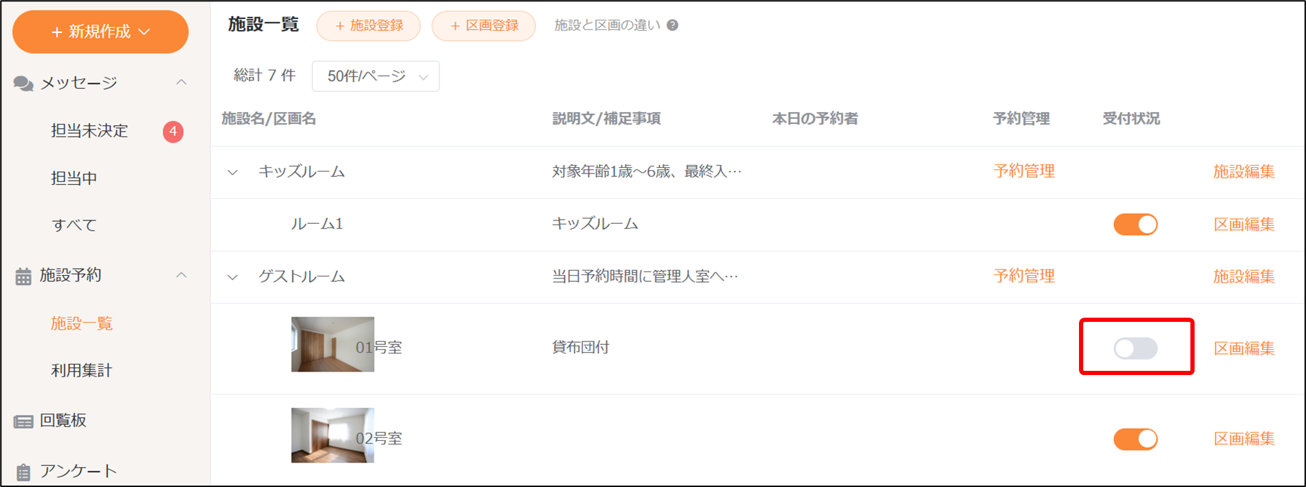- 【区画】では、予約受付のON/OFFを切り替えます