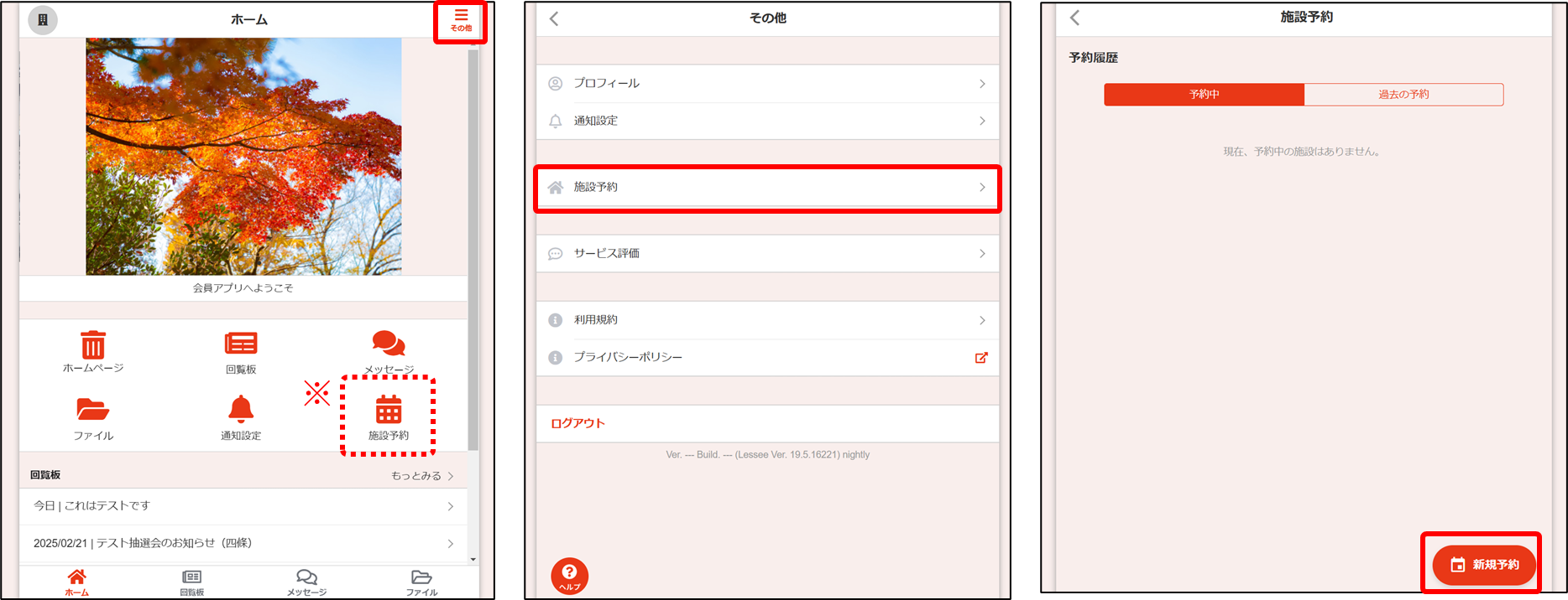 ①会員アプリの[その他>施設予約>新規予約]を選択します。