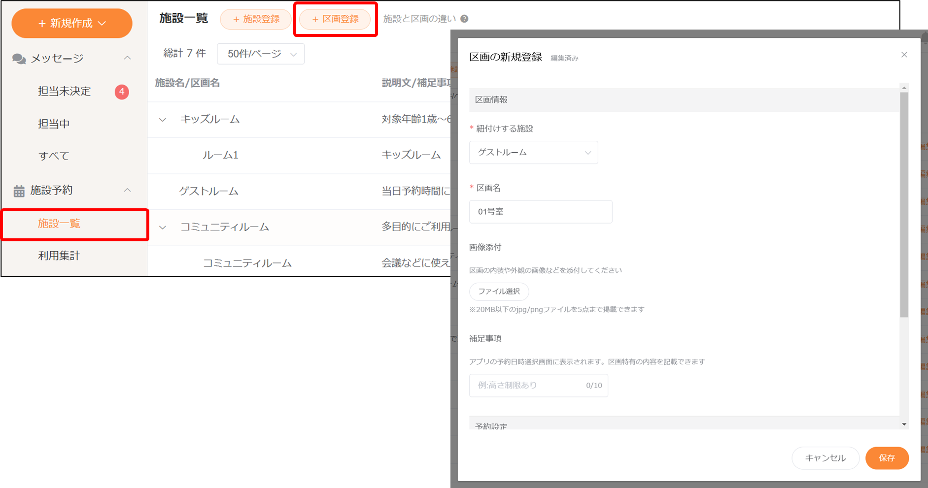 [施設予約>施設一覧>+区画登録]から区画の新規登録画面を開き、区画情報を登録します。