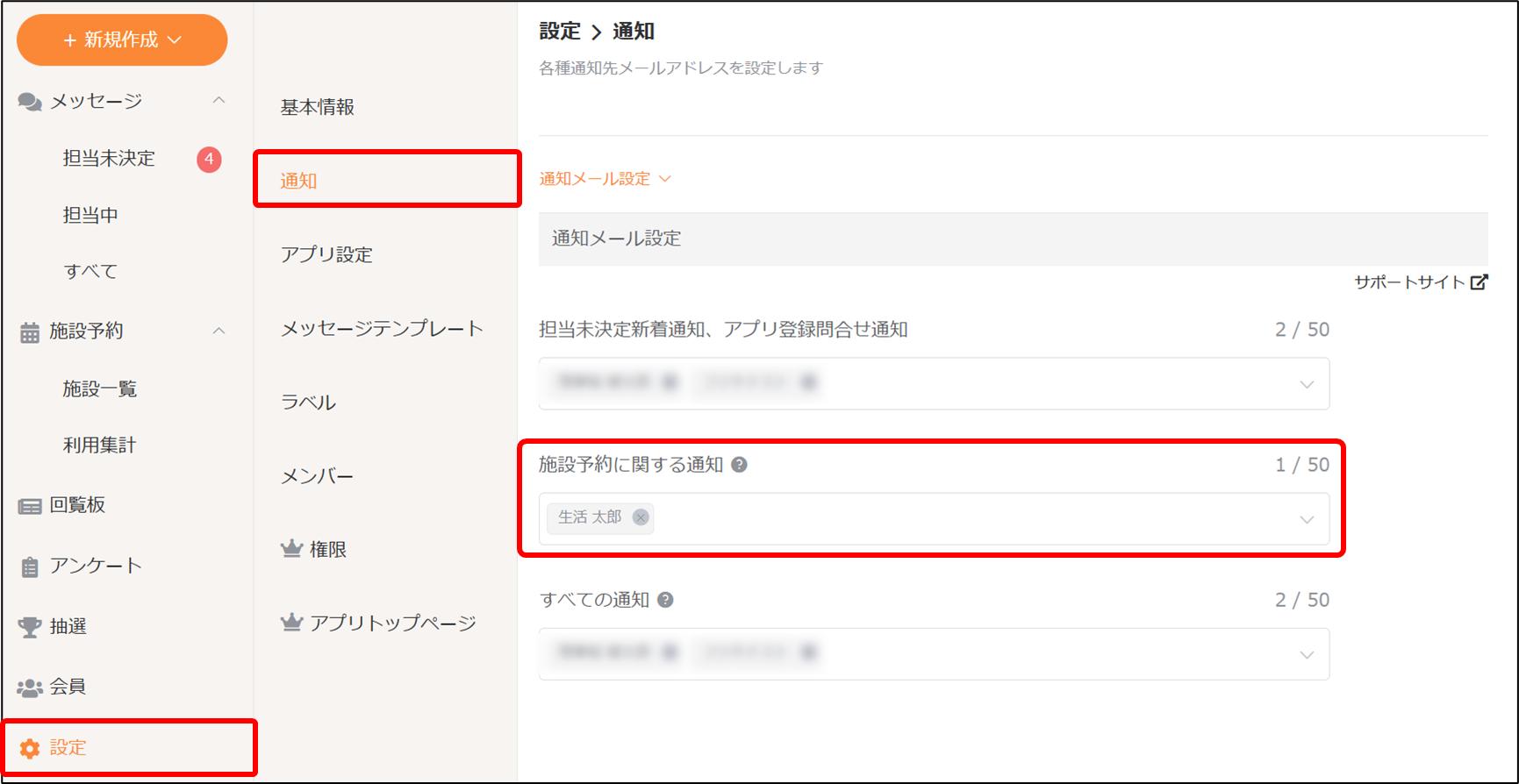 施設予約完了時とキャンセル時の通知メールを受け取れるメンバーを