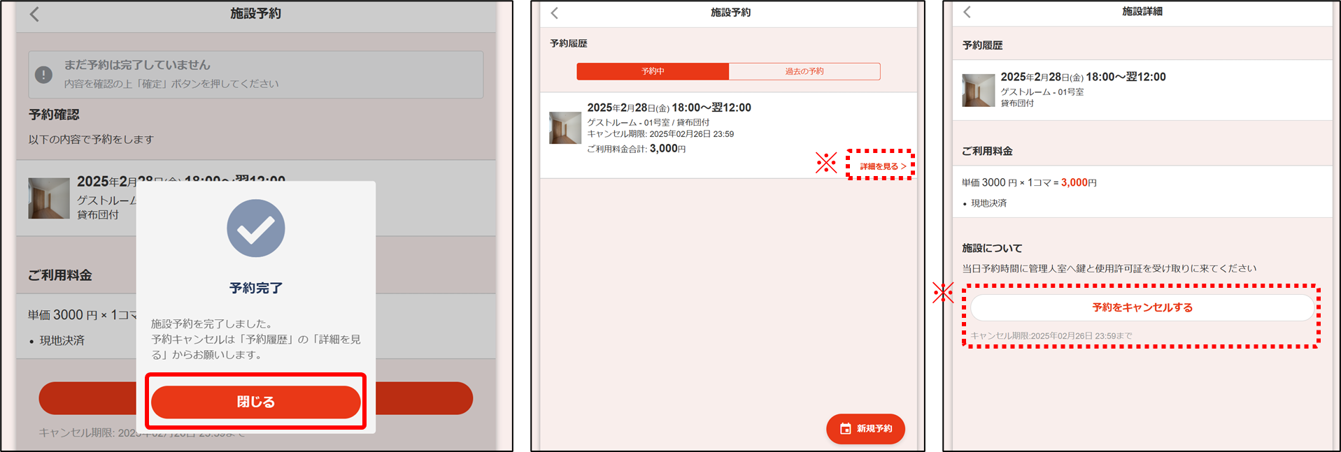 ※会員はキャンセル期限内であれば予約履歴の「詳細を見る」より予約キャンセルが可能です。